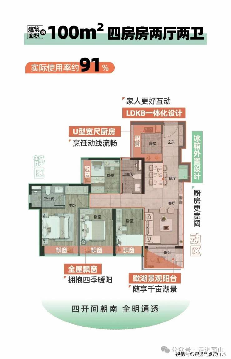 【100㎡四房两厅两卫】• 同等面积多一房• 实际使用率约91%• 东南朝向 看湖看景