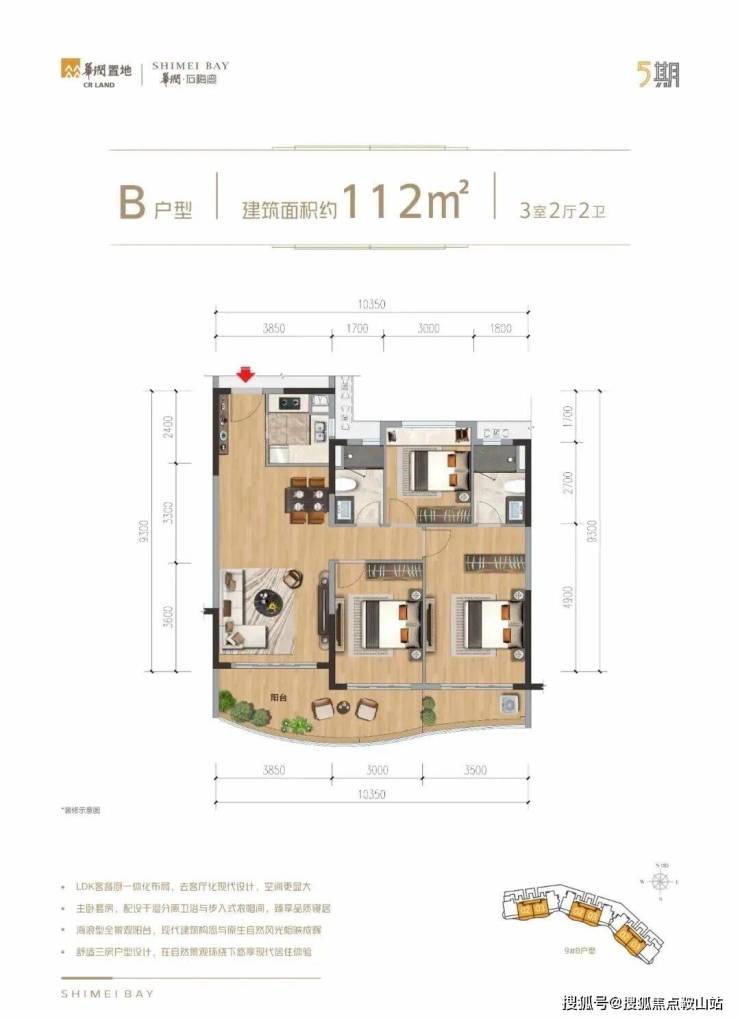 |建筑面积约105㎡○三卫设计,舒适起居,生活自在不拥挤○户型方正,全明设计,纵览山海风景○LDKB专享度假感格局,丰富生活层次○餐客厨与卧室,南向三开间,阳光满室○套房式主卧,约8.4m朗阔阳台,环瞰山海