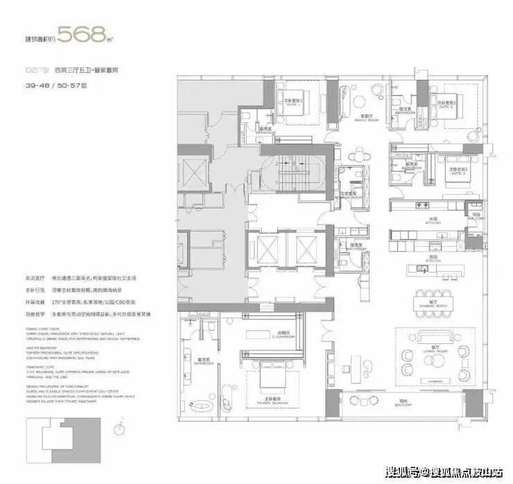 南北通透三面采光,顶奢总统套房规格,270°全景套房,享受湿地/公园/CBD景观,都是套房设计,更具私密性,中西厨分离。