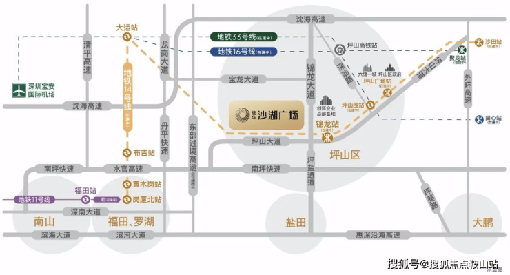 佳华沙湖广场项目位于坪山区坪山大道与锦龙大道交汇处西北角(在建14号线锦龙站旁),项目是包含商业、办公/公寓、住宅、幼儿园于一体的大型综合体,总建面超62万㎡。隔壁是深业国际东城、力高君御国际等住宅区。