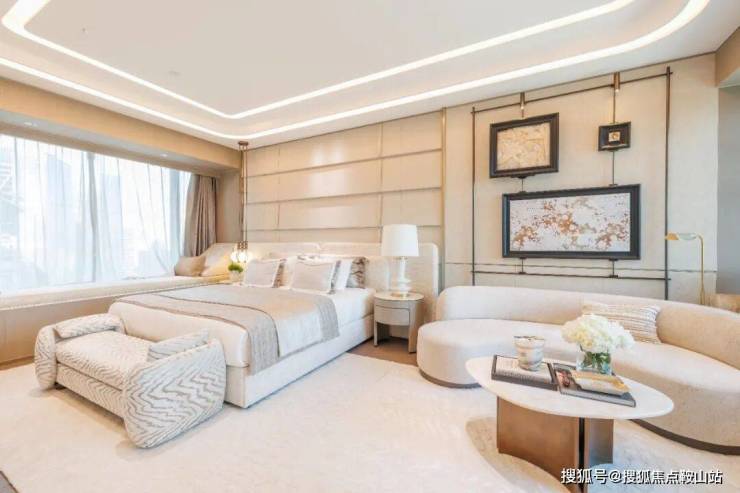 墙面铺贴米白色大理石,点缀以金属线条,简约质感中又有硬朗的提亮元素,背景墙面星级酒店才会用的潘多拉石材,多种稀贵材质,组合得恰到好处,在空间艺术的审美上,已经不是一般品质盘能有的段位。