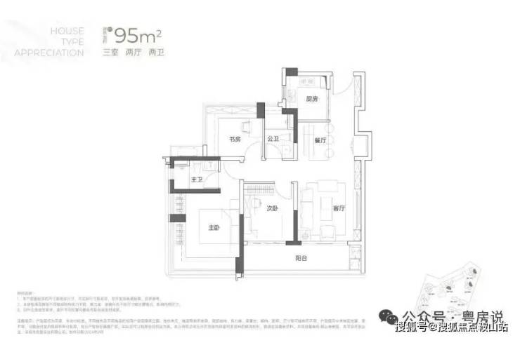 95㎡的3房2厅2卫:传统竖厅格局,客厅开间3.5米,LDKB一体化,S墙设计预留冰箱卡槽位,3个卧室分别做到了3.6米/2.8米/2.8米的宽度,主卧加1个次卧270°全景飘窗,客厅连接次卧出6.3米长的大阳台,U型厨房,得房率约95-97%(包含赠送),西南或东北朝向。户型分布在2栋2/3单元04/05户型,东北朝向看大南山、2栋1单元04/05户型西南朝向看小区;