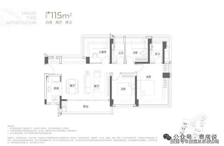 115㎡的4房2厅2卫:横厅南北通透格局,客餐厅6米开间,LDKB一体化,全屋飘窗,4个卧室分别做到了3.9米/3米/2.8米/2.6米的宽度,主卧加1个次卧270°全景飘窗,客厅出6米长的大阳台,L型厨房,得房率约95-97%(包含赠送),西南或东南朝向。115平米户型分布在1栋1单元、1栋2单元、1栋3单元01/02户型,01户型西南朝向都是看小区外围,02户型看向小区;