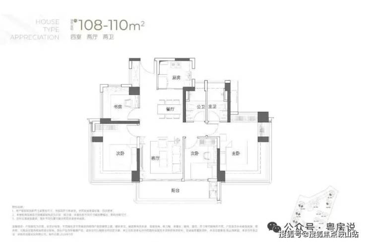 108-110㎡的4房2厅2卫:竖厅双龙抱珠格局,客厅开间3.5米,LDKB一体化,4个卧室分别做到了3.7米/3.4米/2.8米/2.6米的宽度,主卧加2个次卧270°全景飘窗,客厅连接次卧出6.1米长的大阳台,U型厨房,得房率约95-97%(包含赠送),西南或东南朝向。户型分布在1栋1/2/3单元03/04户型,03户型东南朝向,04户型西南朝向;只有2栋2/3单元看小区,其他都看向小区外部;