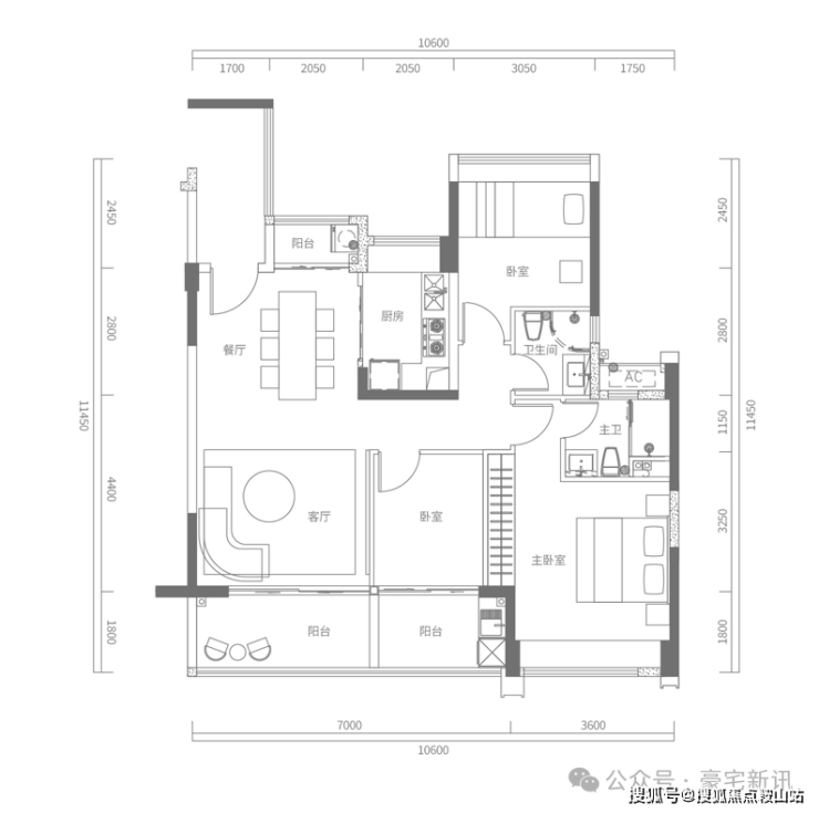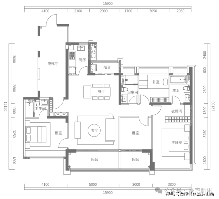 D户型建面约173㎡,4房2厅2卫