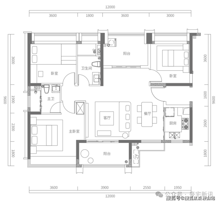 C户型建面约120㎡,3+1房2厅2卫