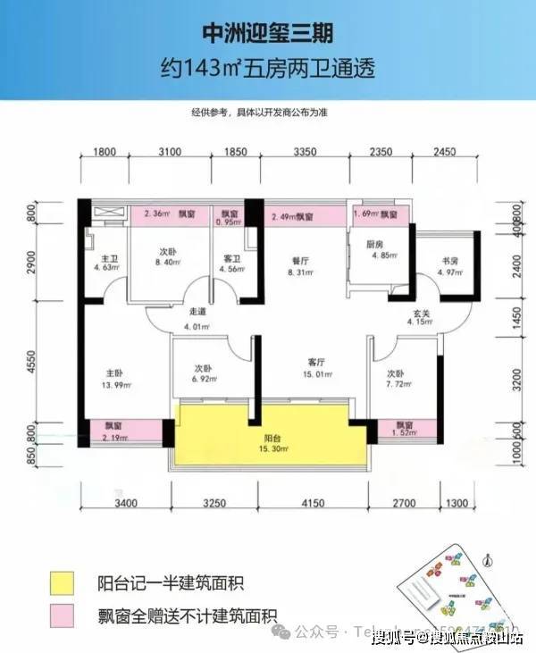 143㎡的5房2厅2卫,设计的是竖厅南北通透格局,进门入户玄关,客厅4.15米开间,LDKB一体化设计,四开间朝南,5个卧室分别做到了主卧16.18㎡/次卧10.76㎡/次卧7.72㎡/次卧6.92㎡/次卧4.97㎡(包含墙体飘窗),客厅连接次卧出7.4米长的大阳台,U型厨房,卫生间干湿分离,赠送面积高达18.85㎡,阳台主朝正南向。