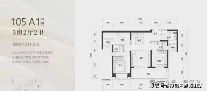 104㎡的3房2厅2卫,A1户型(2栋3单元03户型),设计的是竖厅类双龙抱珠格局,客厅3.6米开间,客餐厅一体化设计,3个卧室分别做到了主卧12.8㎡/次卧12㎡/次卧8.7㎡(包含墙体飘窗),客厅连接次卧出6.5米长的宽景大阳台,U型厨房,公卫三段式分离,得房率约90%(包含赠送),东南朝向。