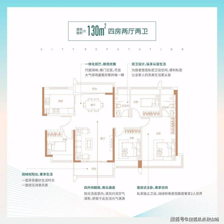 130㎡的4房2厅2卫,设计的是竖厅南北通透格局,客厅4.1米开间,一体化双厅双阳台,四开间朝南,主卧270°转角飘窗大套间设计,U型厨房,卫生间干湿分离,得房率:78.43%(不含赠送),阳台主朝东南向。