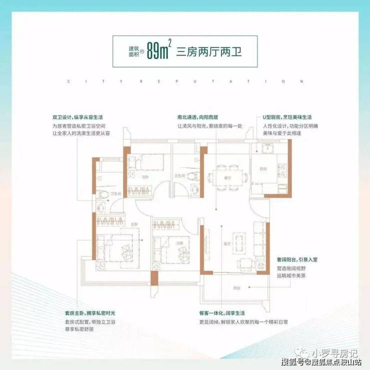 89㎡的3房2厅2卫,5栋02户型,设计的是经典竖厅格局,客厅3.6米开间,LDKB一体化,动静分区,三开间朝南,主卧270°转角飘窗,U型厨房,卫生间干湿分离,得房率:74.71%(不含赠送),西南或东南朝向。
