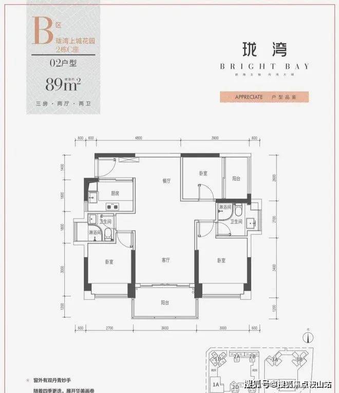 2、户型:建筑面积约89㎡三房两厅两卫,东南朝向,双阳台,主卧套房设计