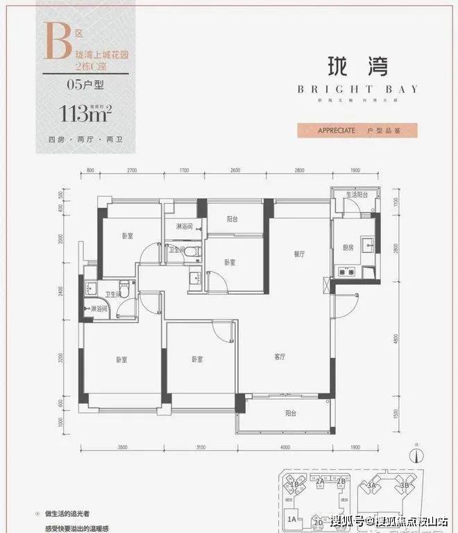 3、户型:建筑面积约113㎡四房两厅两卫,稀缺南北通透,三阳台设计,约4米阔景大阳台