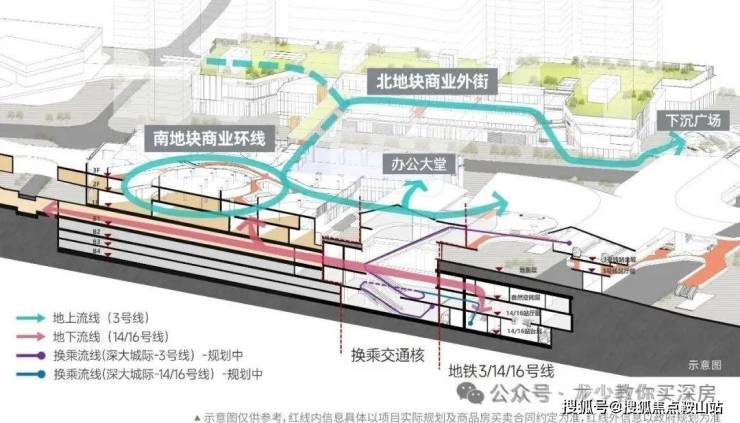 项目分南北两个地块建设,其中北区规划为住宅及裙楼配套商业,南区开发兼顾公共性和便捷性,规划为超高层办公写字楼、大型商业mall等,生活配套完善度及交通便捷性等方面都是龙岗区的标杆项目。