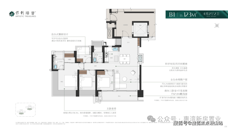 143竖厅户型,5.8米超大客厅开间,开放式L厨房与岛台设计,可以做到4+1格局,满足三代同堂,南北双景观面,南面看海,背面看城,主卧4.3米开间带独立衣帽间,270度转角飘窗城市夜景尽收眼底。