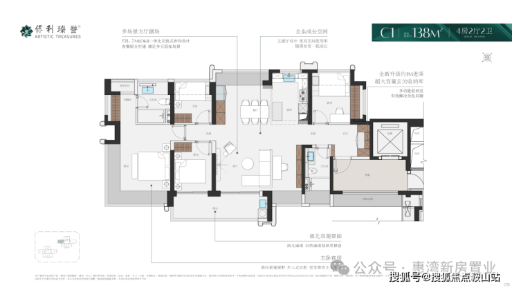 138㎡户型采用场景方厅剧场,约5.7米LDKB一体化开放式布局设计,客餐厨全打通 满足多元居家场景,南北双观景面南北通透 自然通透观景更惬意,主卧套房南向景观视野 步入式衣柜 更享尊崇主人生活品。
