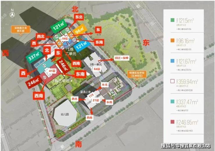 项目位于福田区沙头街道新沙路18号,项目由3栋超高层建筑及1栋多层建筑构成,包含回迁房、保障房、商品住宅、酒店及商务公寓等业态,配建一所幼儿园,旁边规划建设一所小学。1栋由回迁房与保障性住房组成,64层加地下3层,楼高196.8米。2栋为商品住宅,59层加地下5层(含两层半地下室),楼高189.15米。3栋由酒店、商务公寓、人才住房组成,40层加地下4层(含一层半地下室)楼高172.85米。本期销售住宅有260户,其中户型套内建筑面积小于90㎡为230套,占比88.46%。