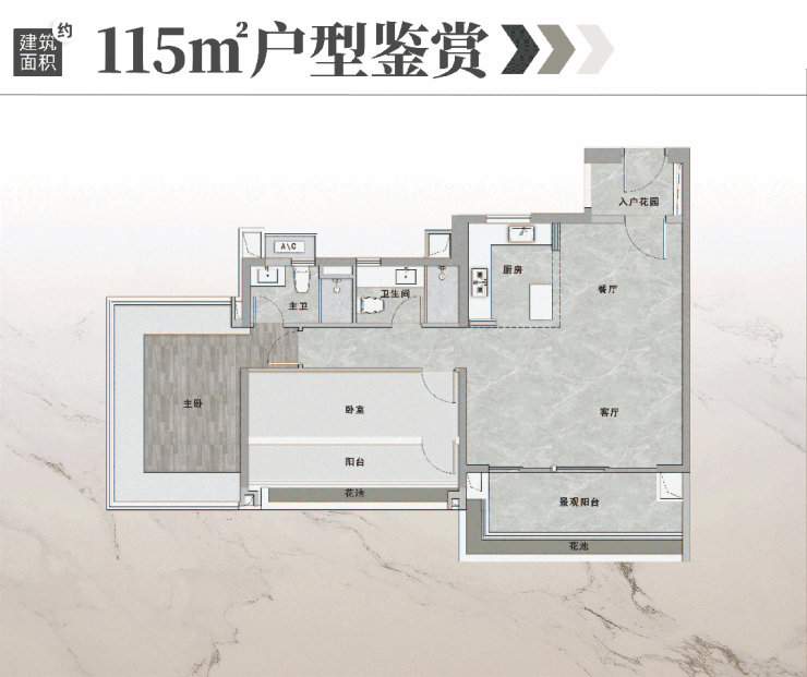 建面115平四房,做到了四开间朝南,约5.8米的宽景+花池赠送可做两房,该户型做到21米的南向采光面。