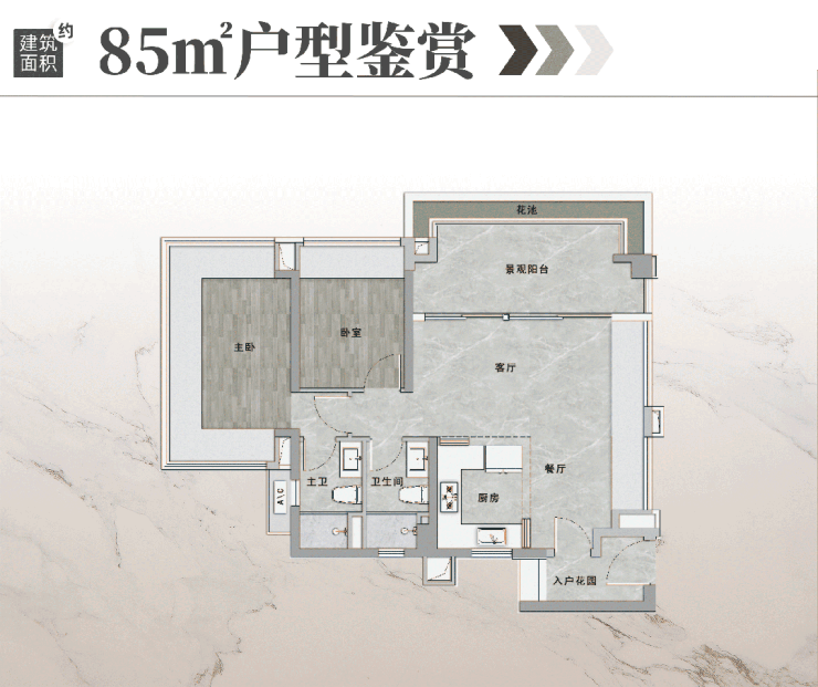 建面85平三房,带入户花园,户型方正通透,南向超大面宽,该户型是众多户型中赠送面积最多使用率最高的户型。