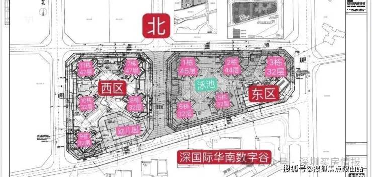 西区:占地2.2万㎡,容积率5.16,包含住宅、商业、幼儿园学校和其它基础配套设施。7栋栋总高47F,3T6户;8栋、9栋、10栋总高32F,2T5户;11栋总高46F,3T6户,2T5户;1栋是幼儿园。