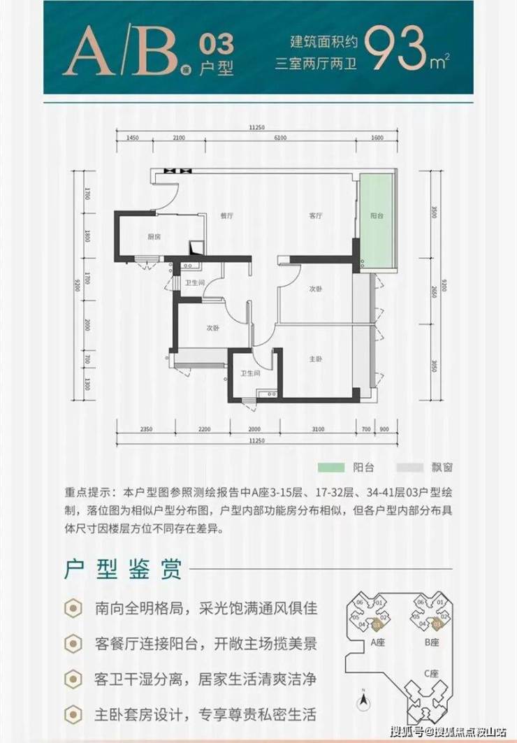 93㎡的3房2厅2卫,设计的是竖厅格局,客厅实测3.29米开间,LDKB一体化设计,三开间朝南,动静分区,进深9.8米含阳台,3个卧室分别做到了主卧11.42㎡/次卧8.85㎡/次卧6.72㎡(实测面积,去掉墙体),L型厨房,公卫三段式分离,得房率约76.2%(不含赠送),西南或东南朝向。套内面积71.07㎡+实测赠送面积7.81㎡,加上赠送得房率84.6%。