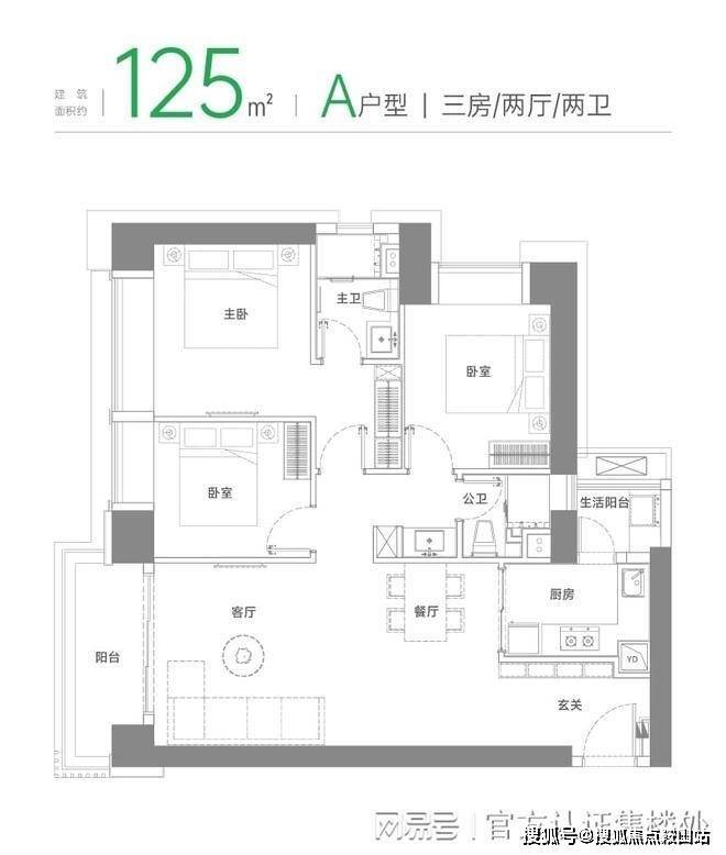 125㎡3房2卫:809套(A户型646套+B户型99套+C户型64套)
