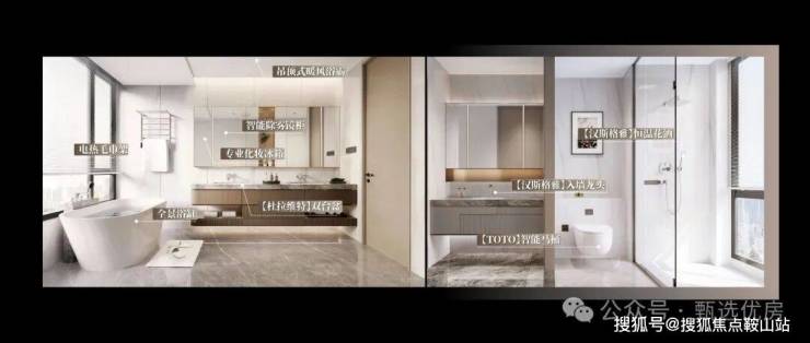 【德系智能卫浴系统 定义洁净新体验】对标世界顶级酒店配置,提供总统套房级盥洗体验。卫浴皆为百年德式品牌汉斯格雅,配备杜拉维特双面台盆、景观浴缸、化妆冰箱、暖霸、TOTO马桶等全球高端名品。