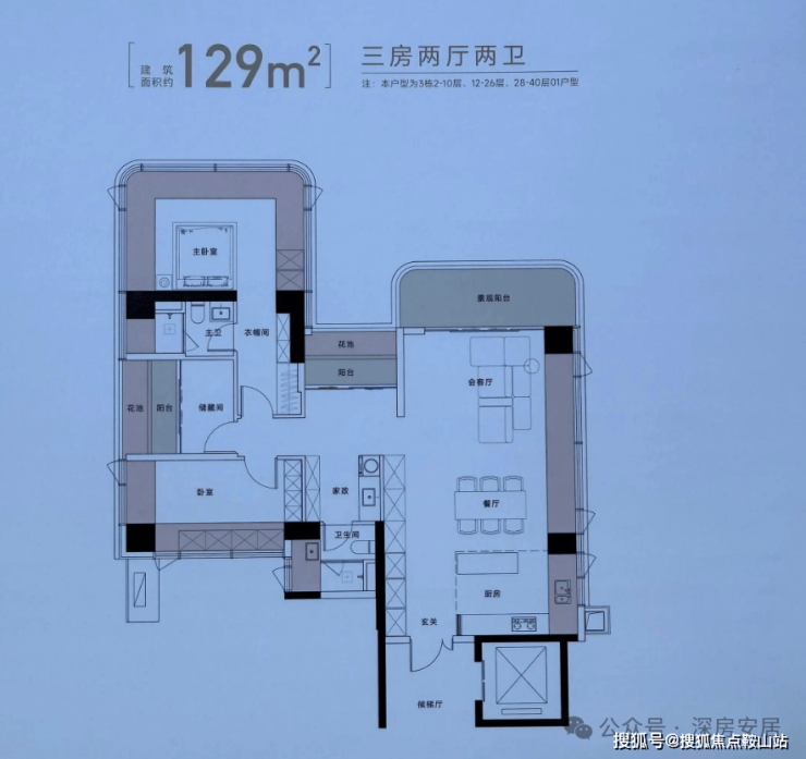 建面约129㎡户型,得房率约105%(包含赠送),东北朝向看一线梧桐山景观。跟127㎡户型只差了2㎡,格局却千差万别。