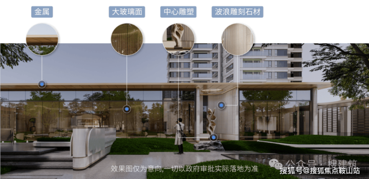在近人尺度的基座表皮上,通过石材与金属铝板的碰撞,并结合柔和的弧线外立面设计,拥有更好的比例、艺术性与美感,使其在众多建筑中脱颖而出,纯浅色立面效果为建筑物增添独特的魅力。