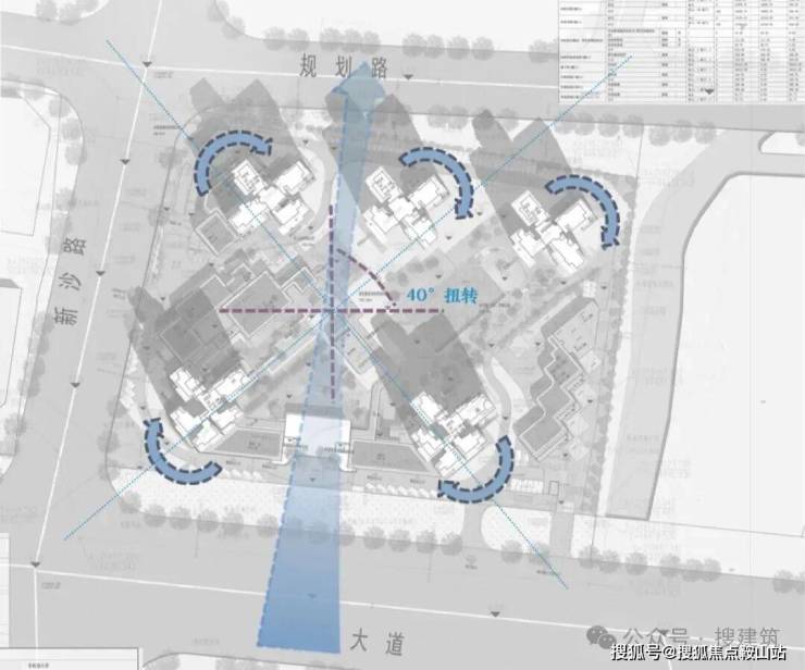 在面对广州稀有的恒藏双江优越条件,必须极致利用此绝版的景观资源。通过多方案重重推演,最终设计团队以40度旋转围合式布局,重构规划空间关系,确保每户实现270度景观视野,突破传统行列式排布的均质性,让建筑群体避免对视压迫,实现“户户南向,双江入画”的视野特权,实现景观最大化利用。