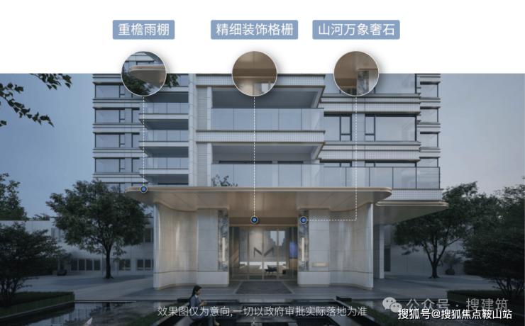 超高窗地比、全面屏的设计、柔和色调中的艺术气息,让整个建筑瞬间变得通透轻盈,在保留了建筑外立面优雅、沉静气质的同时,勾画出简洁轻奢的外立面。首层5.4米入户门庭,高台宽檐,精工材质搭配,强化“高门阔府”的仪式感。