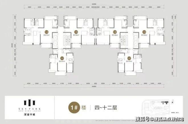 1栋:产品是面积段为137-185-192㎡的3房、212㎡的4房、以及4套300㎡以上的顶层复式单位,其中36层及以下为2梯3户“品”字形结构,37层及以上为2梯2户的板楼结构;
