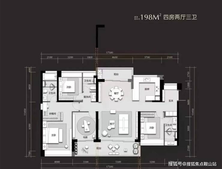 1、建面约198㎡四房,空间感远超市面250㎡产品