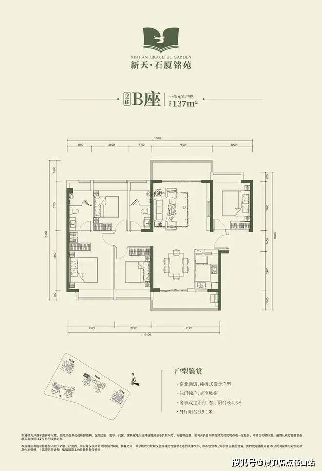2栋B座一单元01、04户型、2栋B座二单元01户型:面积约为137-138㎡的4房2厅2卫;