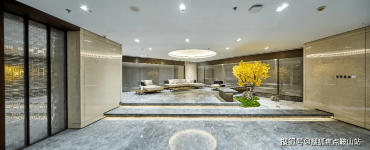 胤璞公寓的车库大堂也打造得大气豪华。车库大堂设置了沙发休息区,并在旁边打造日式枯山水景观,营造充满宁静禅意的意境,打造出归家的仪式感以及私密感,希望业主回到家的那一刻回归内心的宁静感与“慢下来”的生活方式。