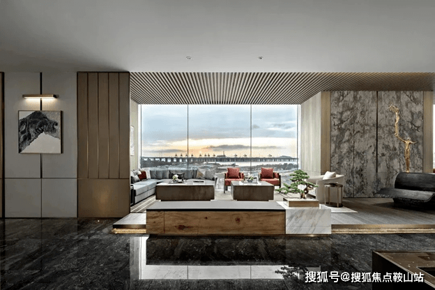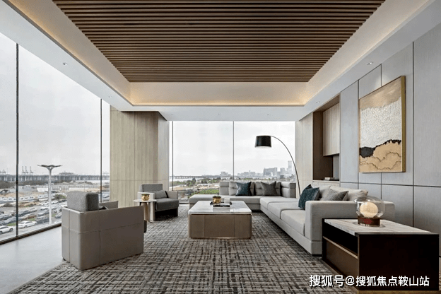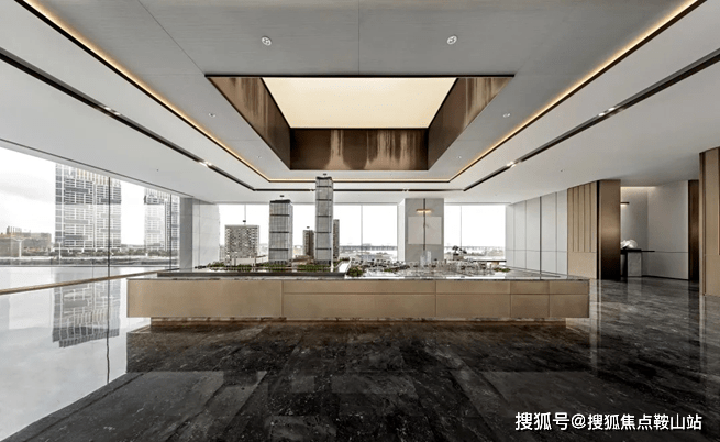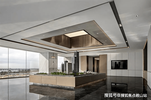 四层的多功能开放公共空间,开阔的平层空间内沙盘示意、公共艺术展示、休憩与交谈等多种生活社交场景都得到恰到好处的呈现,功能分区清晰,形成对顶级圈层的保护。