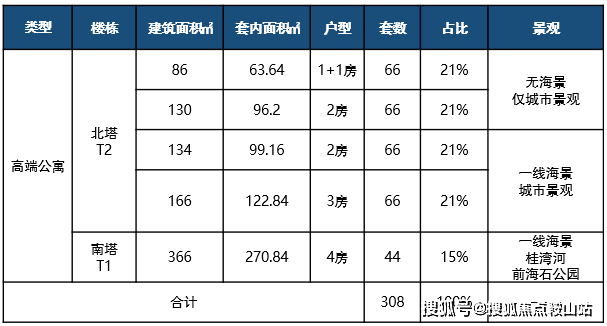 公寓共2栋,主力户型建筑面积约130-370㎡,约300多套可售。