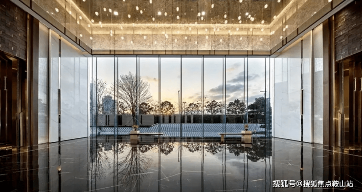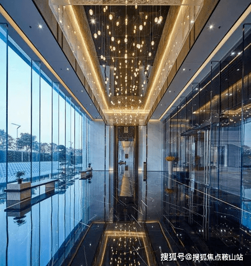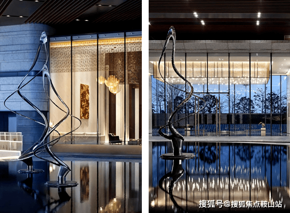 艺术雕塑之下的循环水景,倒映着的夜晚,流光溢彩,呈现如此绚丽景致的背后,是各项细节与工艺的深层考究和应用。它在设计上有个非常大的亮点,抬头看去,雕塑上方的穹顶流动了水波纹,与4楼架空层园林方形的水墨台浑然一体,同时天气晴朗时,阳光射下来,也会映射到下面的水面上,波光粼粼。象天法地,天圆地方,也象征着源源不断的财运。