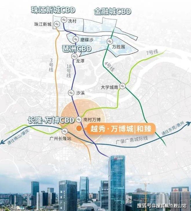 地铁3/7/18号线交汇,步行至南村万博站约1.3公里,3站达琶洲、4站至珠江新城