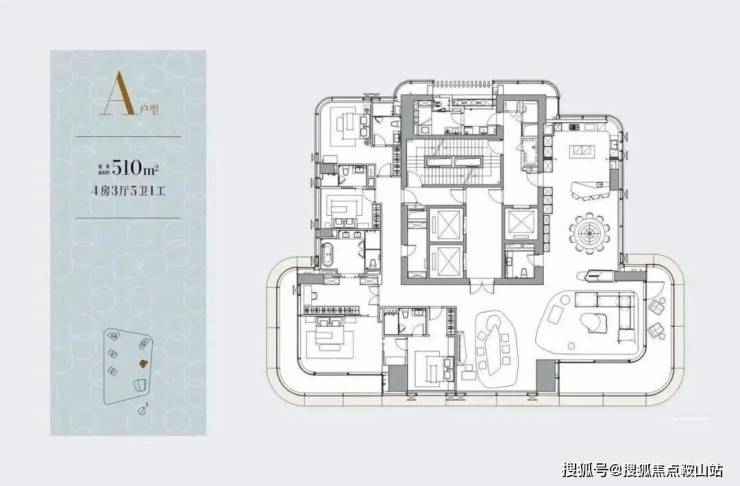 512㎡4+1房2厅5卫+家政,3T1户,客厅约12.5米进深,开间7米,客厅、主卧L型阳台。