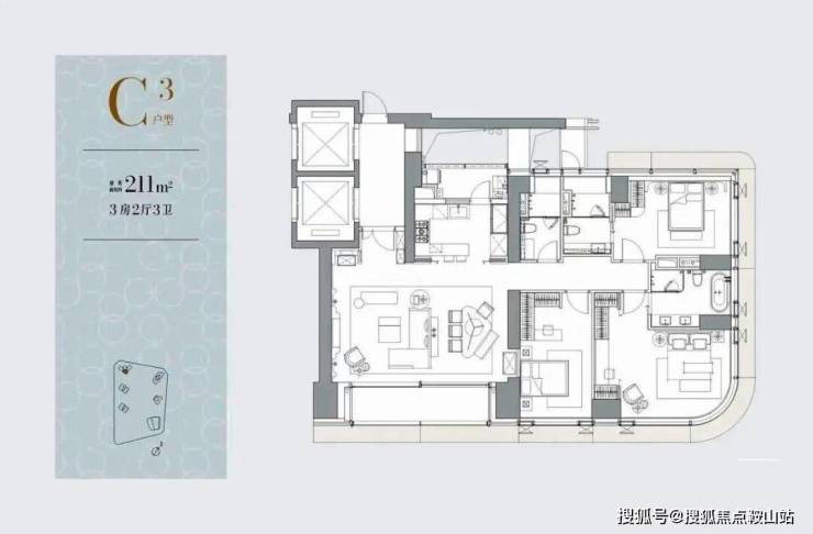 211-218㎡3房3卫+家政,4T3户,客餐厅约4米进深、8米开间,阳台开间约7米。