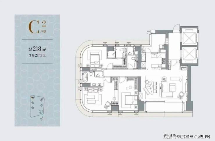 302㎡4房4卫+家政,3T2户,客餐厅约8米进深、7米开间,L型阳台。