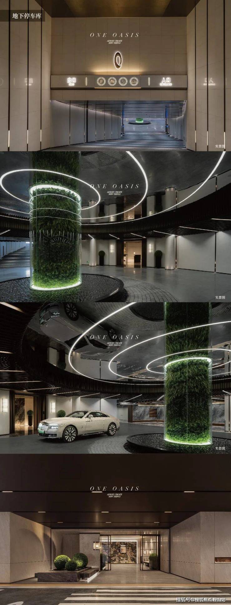 发光镜面天花板,将光线映到地下,绿植玻璃筒,将自然的气息与生机带入地下。
