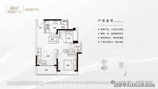 竖厅格局,客厅3.4米开间,LDKB一体化设计,动静分区,L型厨房带1个生活阳台,卫生间三段式干湿分离,得房率约79%(不含赠送),西南朝向