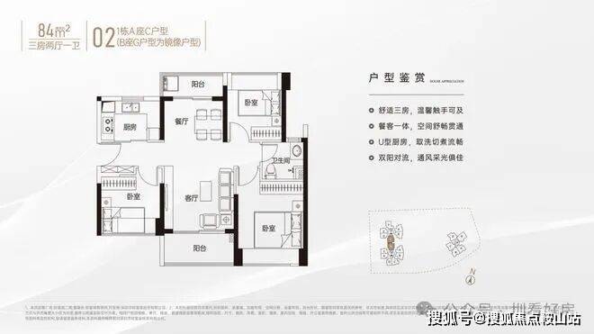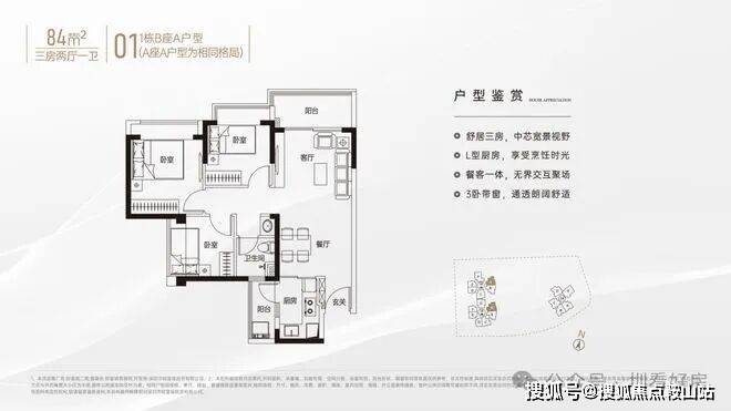 竖厅格局,客厅3.4米开间,LDKB一体化设计,动静分区,L型厨房还带1个生活阳台,卫生间三段式干湿分离,得房率约79%(不含赠送),东北朝向。