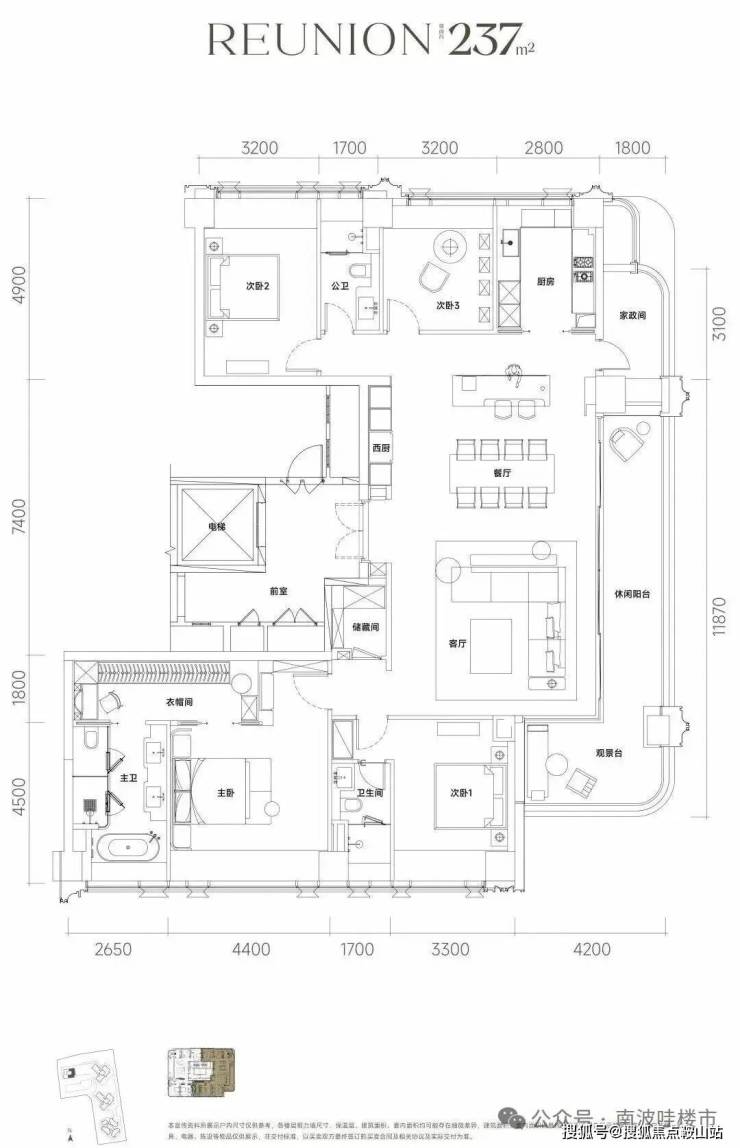 约237㎡ 四房三卫两厅、三面采光、双主卧套房、270°环幕视野。