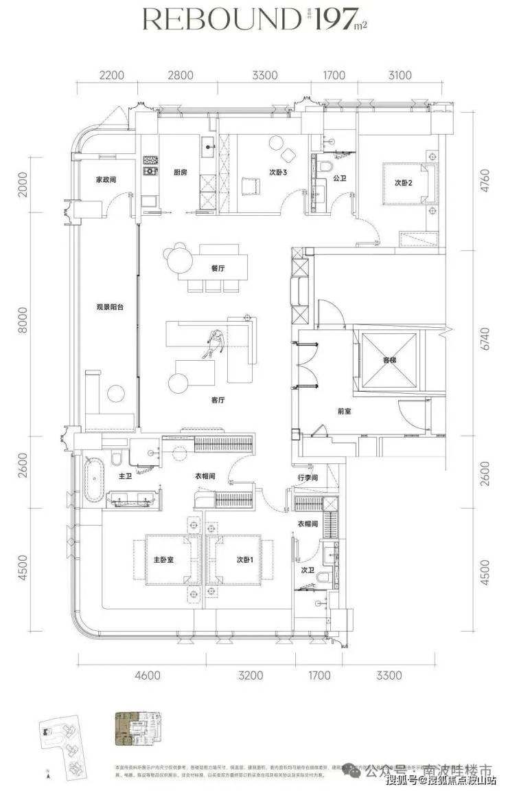 约197㎡ 四房三卫两厅、三面采光、主卧套房、270°转角奢华空间全景落地窗。