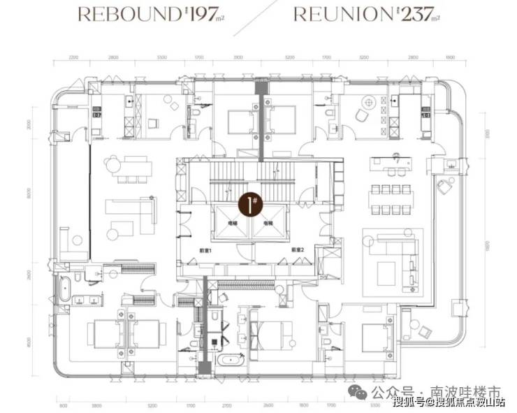 两个户型都是四房三卫+家政间设计,进门就是大客厅,卧室分布于客餐厅南北两侧,均拥有超大观景阳台。