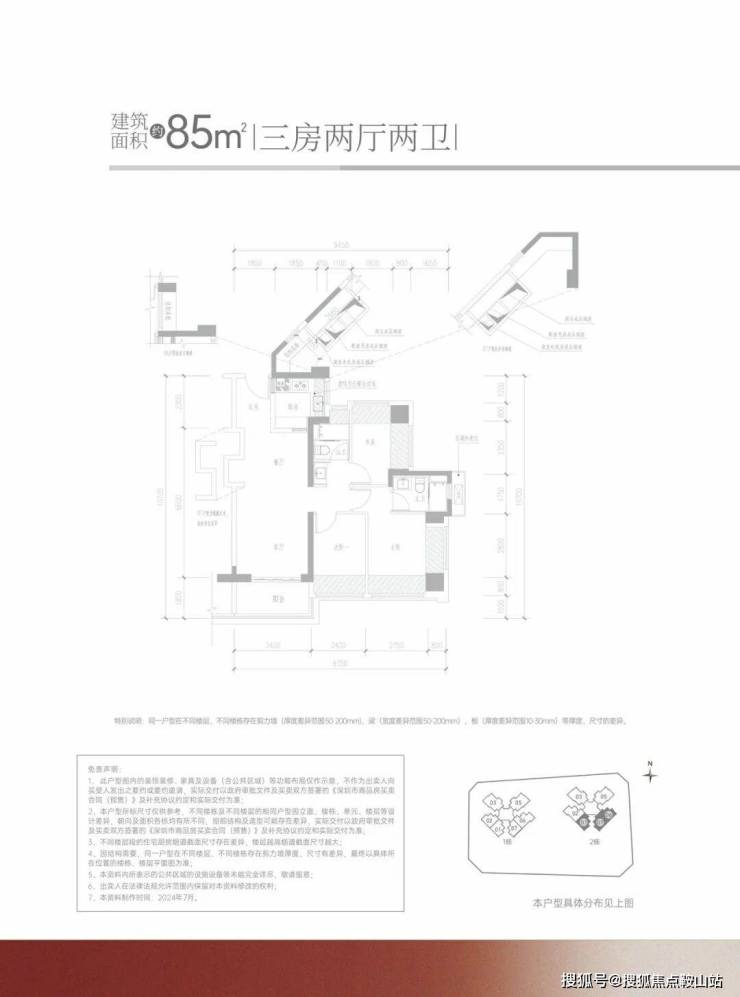 项目户型介绍85㎡的3房2厅2卫,设计的经典竖厅格局,客厅3.4米开间,LDKB一体化设计,S墙设计预留冰箱卡槽位,3个卧室分别做到了3.55米/2.6米/2.4米的宽度,U型厨房,公卫三段式分离设计,得房率约:95%(包含赠送),阳台进深1.8米,有西南或东南朝向。