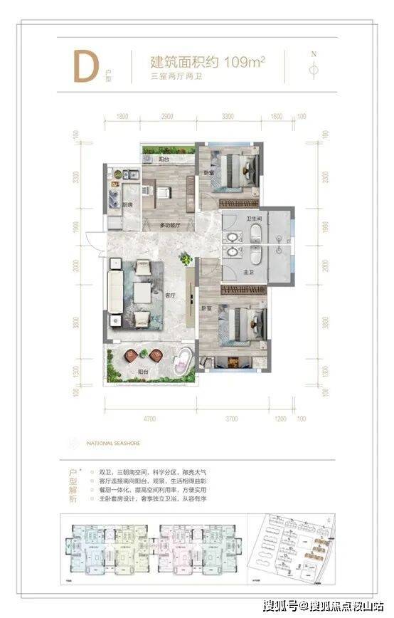 【优居户型】 海棠壹号院全新迭代建筑面积约109-119㎡升级户型,空间布局科学合理,全明户型,南北双阳台,270°环幕视野,重新定义高端品质人居尺度。A 户型109㎡两室两厅两卫