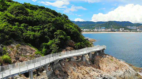 栈道沿山体蜿蜒起伏,左侧绿意葱茏